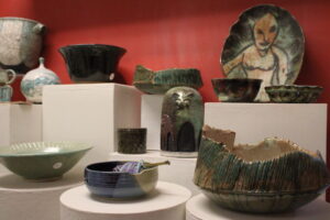 The Potters Shop, on the ground floor, bustled with students, staff and visitors. Bowls, cups, plates, vases and more filled the shelves. Needham artist Barbara Levitov started building up her clay in the hopes of making a pie dish, while Newton South High School junior Judah Kaunfer added details along the sides of a vase.