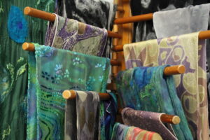 Donson creates scarves, skirts, kimono jackets and other silk pieces. She’s worked in the medium for 25 years and teaches the craft within her studio.