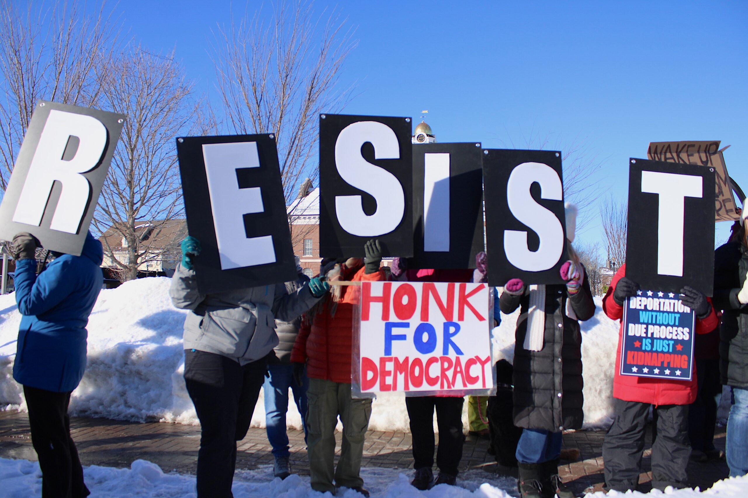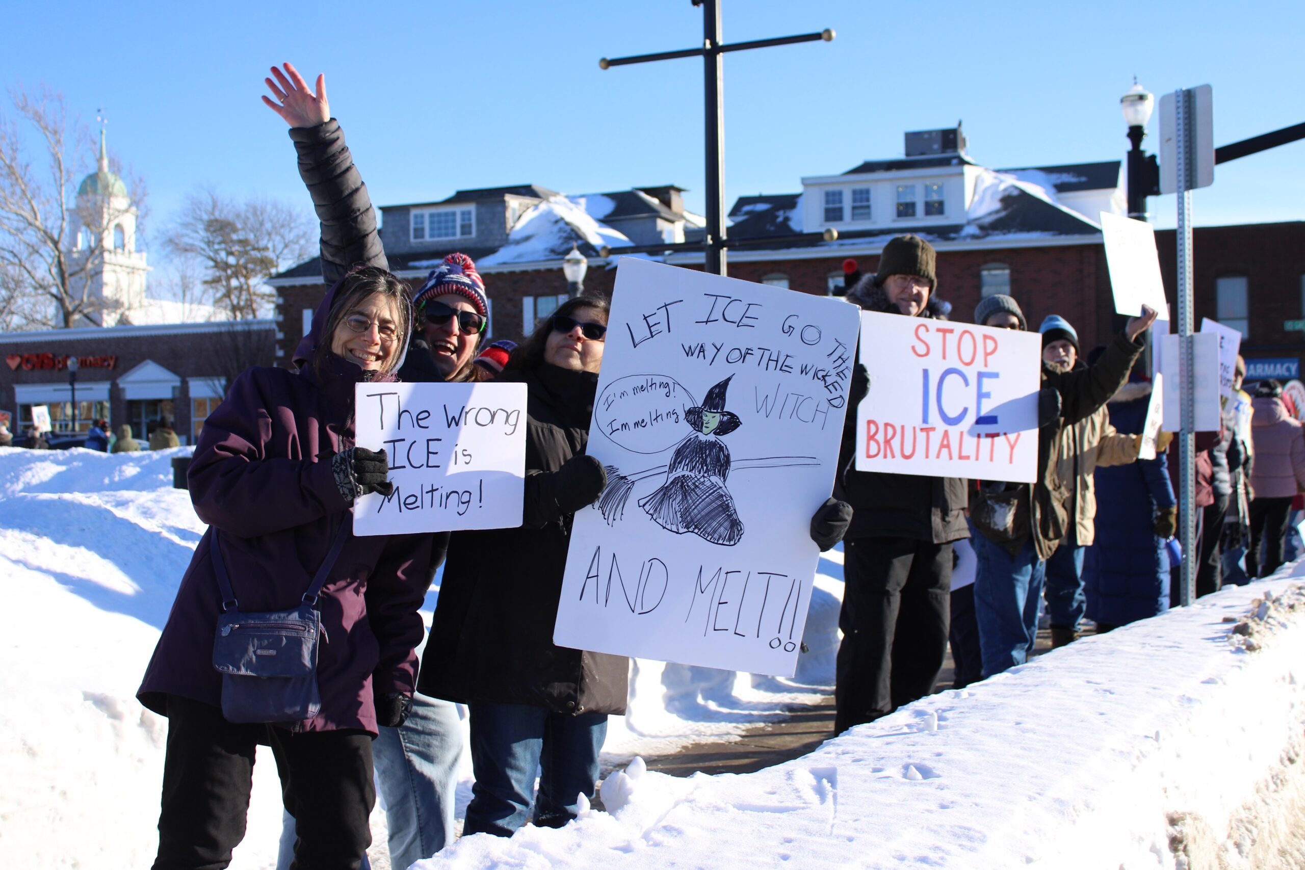 The protests come in the wake of two fatal shootings by federal officers in Minneapolis over the last several weeks. Signs at Needham’s protest memorialized those killed — Alex Pretti and Renee Good — and pictured melting ice cubes and calls to end violence. Needham Resists also held a vigil for Good earlier this month.